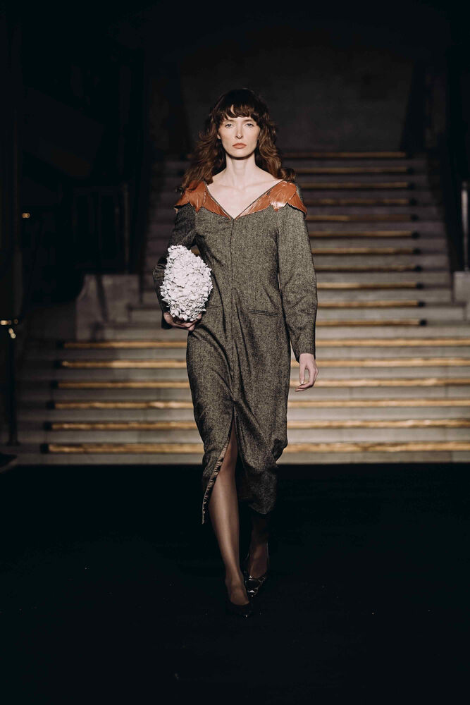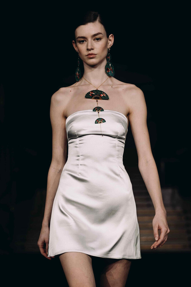 The brand’s philosophy – adapted from a Chinese proverb – is “The greater retreat lies not in the forest, but in the city.” Their collection, Whisky Kiss in the Old City, is inspired by amber whisky, crystal glasses, and shimmering light. Jazz bar drapes and liquid reflections shape the atmosphere, while sequins, beadwork, and fluid fabrics recreate the refraction of light through glass. The silhouettes are close yet restrained, echoing the slow rhythm of jazz to capture an intimate moment of quiet glamour.