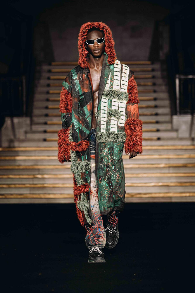 NOIRA presents London Requiem: Beyond Wonderland, a collection weaving a multiverse of narratives centred on three years of life in the city. The trilogy begins with Garrotting, a sartorial satire on London’s nineteenth-century undercurrents of unease, featuring an umbrella dress created in collaboration with the designer’s late friend, Zach. The journey continues through Nirvana Rebirth, a documentation of resilience that symbolises a transformation from consuming red flames to unbreakable blue fire. Finally, Wonderland serves as a fairy-tale tribute, using the absurdity of Alice in Wonderland to mirror the realities of city life. The runway finale unites these chapters in a traversal across life, death, and memory, a spiritual reunion of the designer and their lost muse.